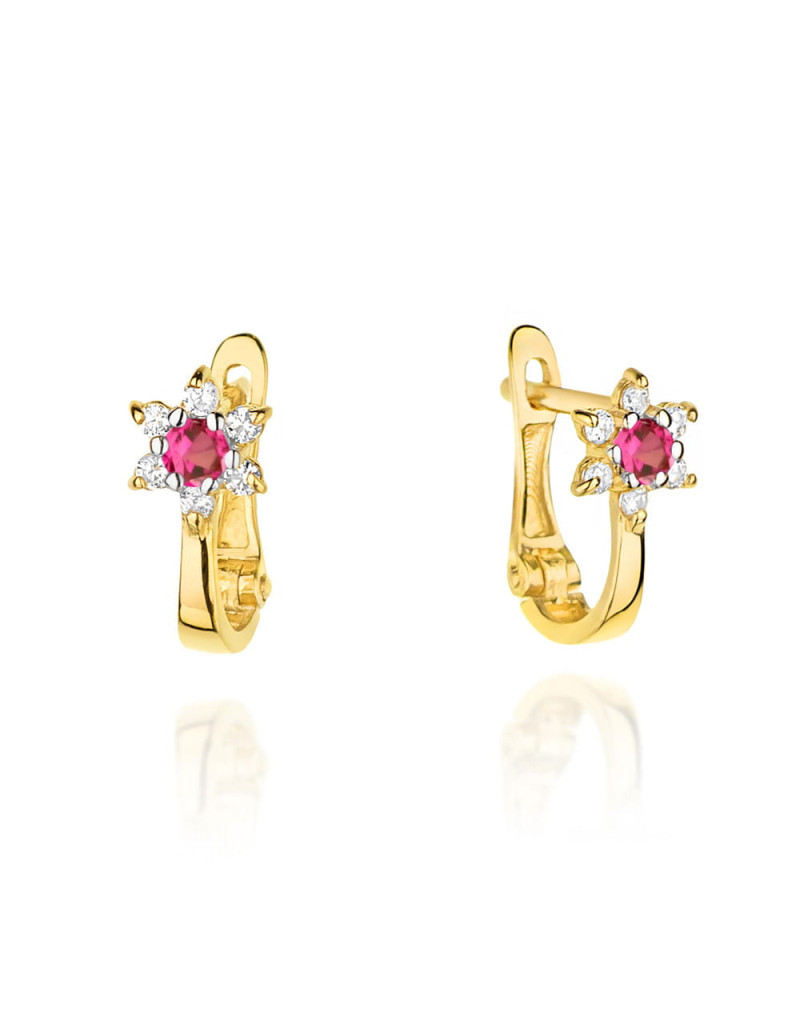 Kolczyki złote kwiatuszki z cyrkoniami i środkiem w kolorze fuksji (Gramatura: 1.01)