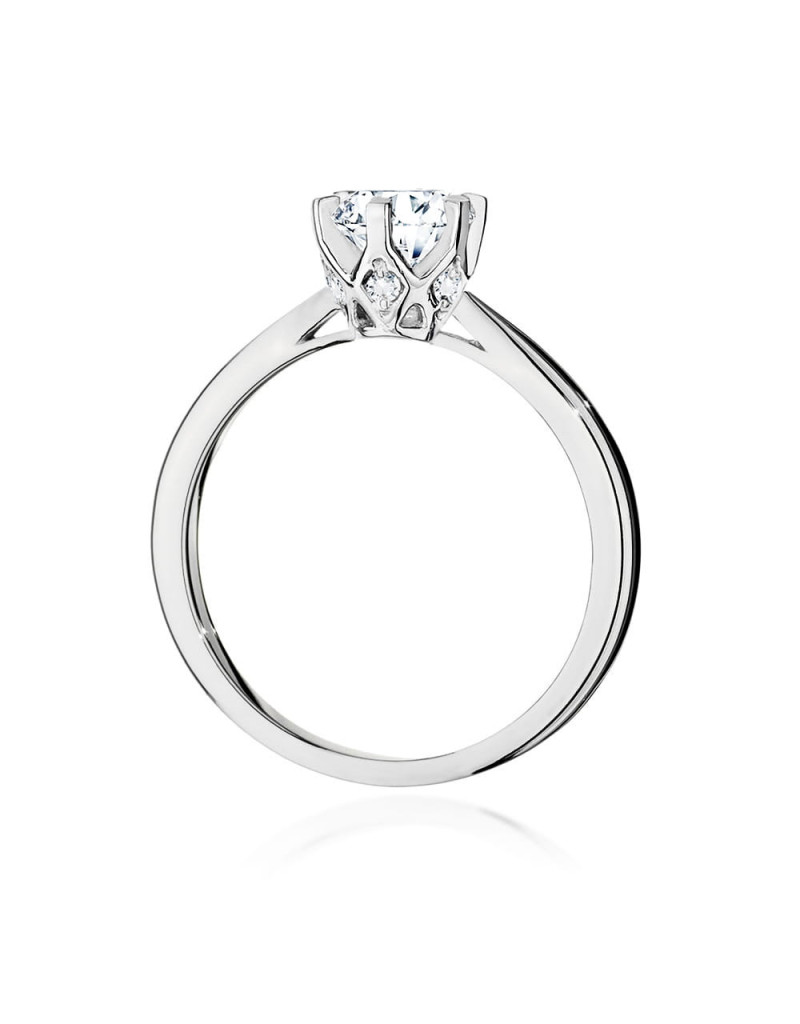 Unikatowy pierścionek wykonany z białego złota z niezwykłym brylantem w sześcioramiennej koronie, oraz szyną ozdobioną brylantami.