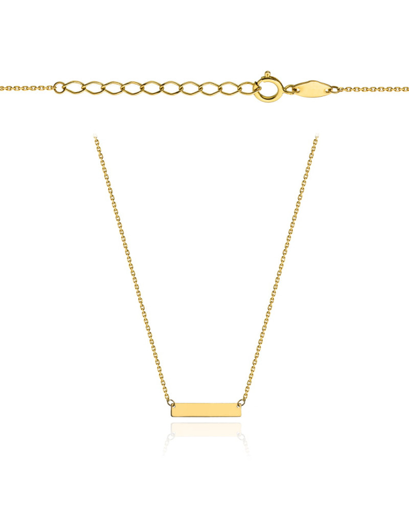 Precyzyjnie wykonana złota celebrytka z modnym elementem - prostokątną blaszką zawieszoną poziomo - doskonale sprawdzi się jako prezent dla bliskiej osoby na urodziny, imieniny, jubileusz czy walentynki. Każdy naszyjnik pochodzi z legalnego źródła, a my wystawiamy faktury VAT, co gwarantuje jakość i bezpieczeństwo zakupu.
