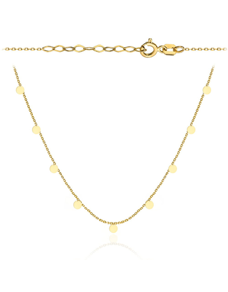 Naszyjnik złoty z wiszącymi kółeczkami 39+3cm to elegancki dodatek, który doda blasku każdej stylizacji. Wykonany z wysokiej jakości złota próby 585, ten wyjątkowy naszyjnik łączy w sobie nowoczesny design z klasycznym stylem.