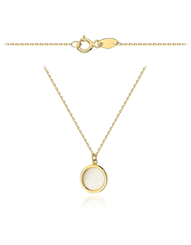 Naszyjnik złoty kółeczko z masą perłową i promieniami to elegancki dodatek, który doda blasku każdej stylizacji. Wykonany z wysokiej jakości złota próby 585, łączy w sobie nowoczesny design z klasycznym wykończeniem.