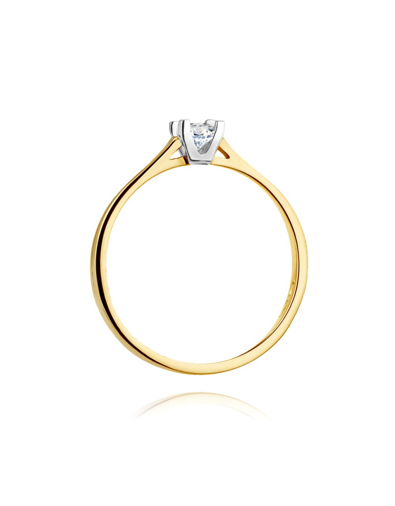 Romantyczny pierścionek z żółtego złota z brylantem w czteroramiennej koronie z białego złota.
