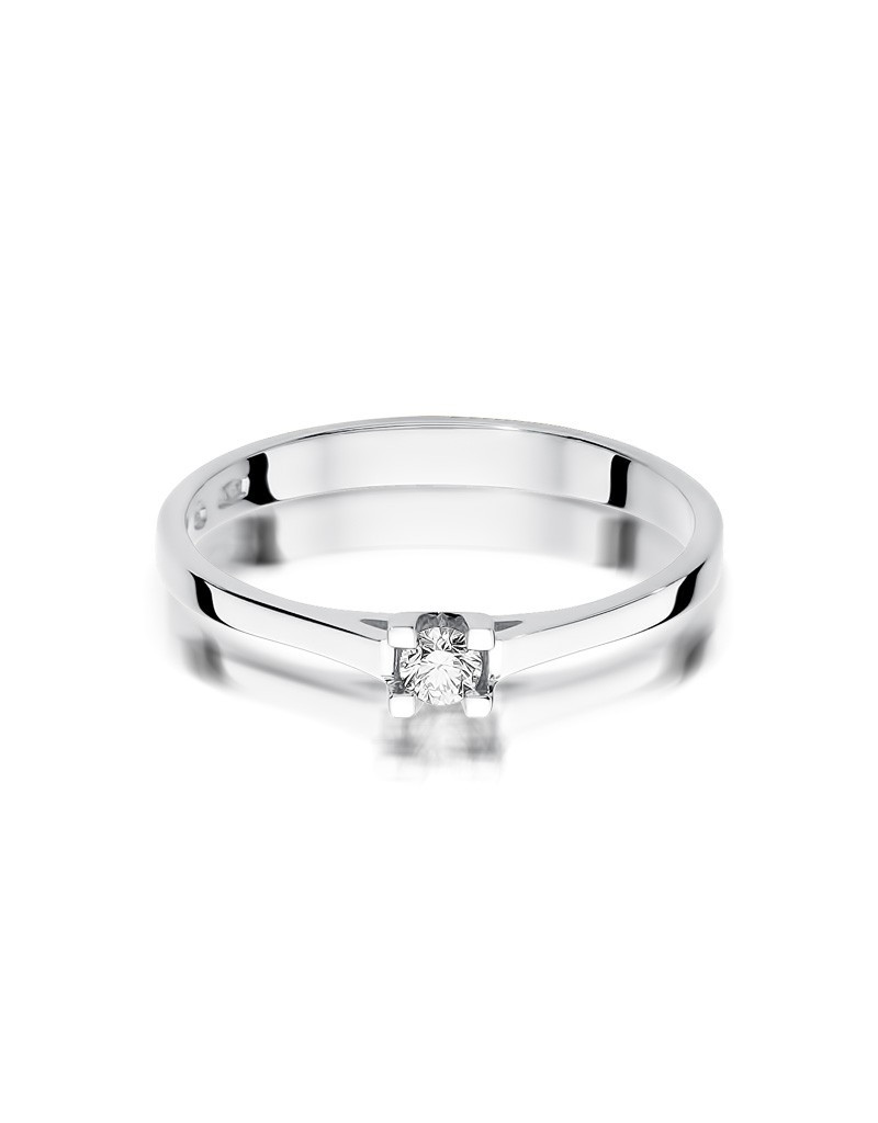 Romantyczny pierścionek z białego złota z brylantem w czteroramiennej koronie.