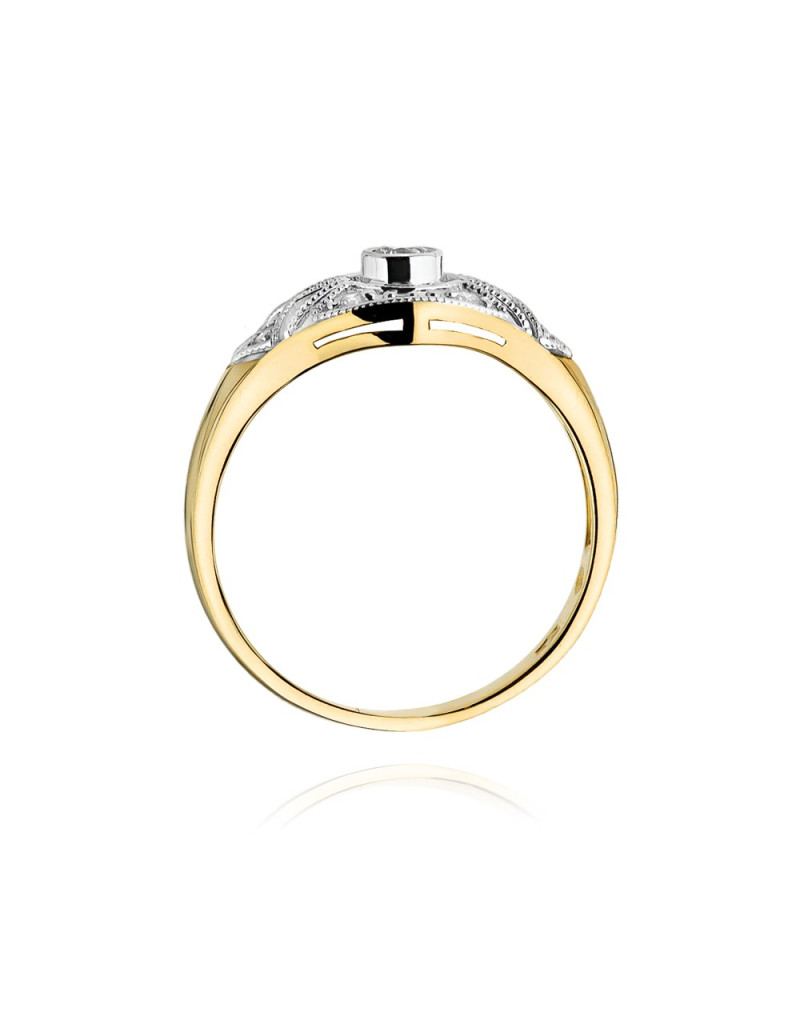 Urokliwy złoty pierścionek w oryginalnej oprawie z 7 lśniącymi brylantami. Wykonany z żółtego i białego złota.