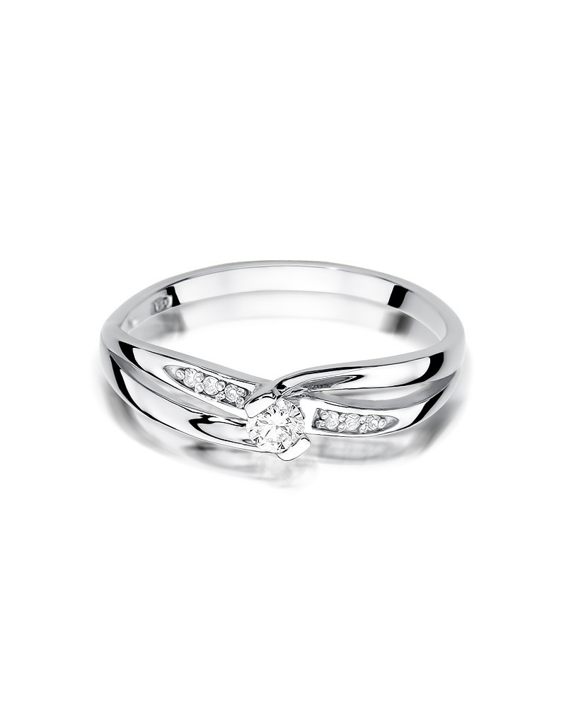 Anielski pierścionek w subtelnej oprawie z pełnymi blasku brylantami. Wykonany z białego złota.