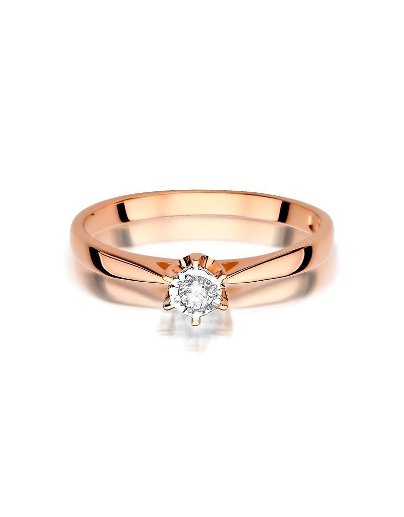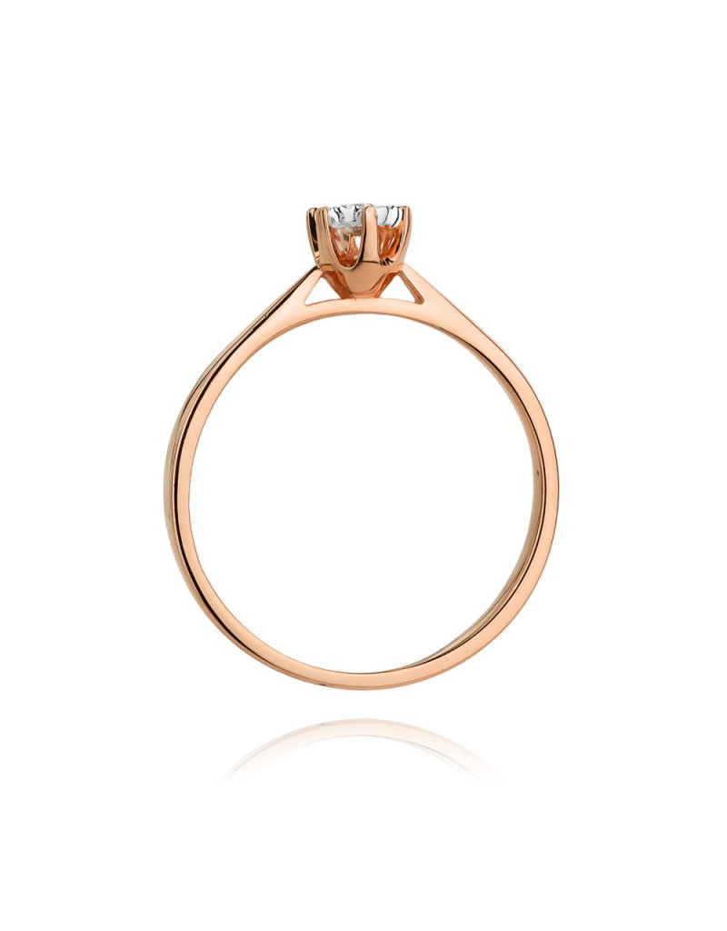 Pierścionek z brylantem w różowym złocie, niepowtarzalny wzór, idealnie pasuje na delikatną kobiecą dłoń.