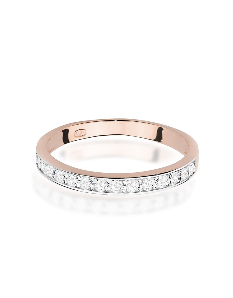 Pierścionek w kształcie obrączki z brylantami w różowym złocie, niepowtarzalny wzór, idealnie pasuje na delikatną kobiecą dłoń.