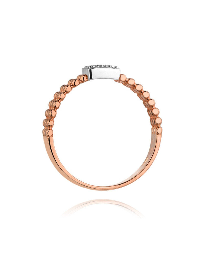 Awangardowy pierścionek z niesamowitą szyną, którą zdobią maleńkie złote kuleczki prowadzące do lśniących brylantów w kwadratowej formie.