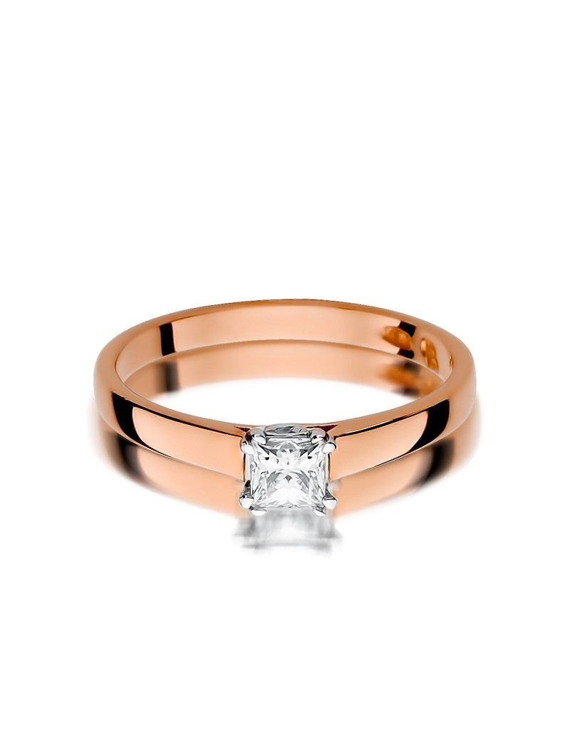 Gustowny i elegancki złoty pierścionek z kwadratowym brylantem w czteroramiennej koronie.