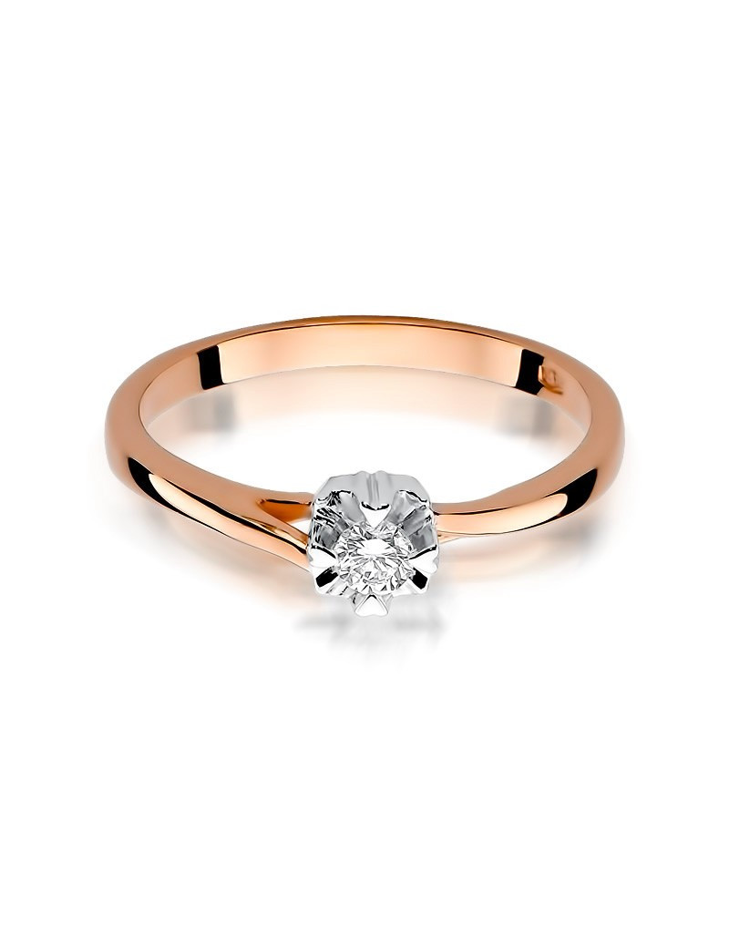 Uroczy pierścionek z lśniącym brylantem w subtelnej oprawie. Wykonany z różowego złota.