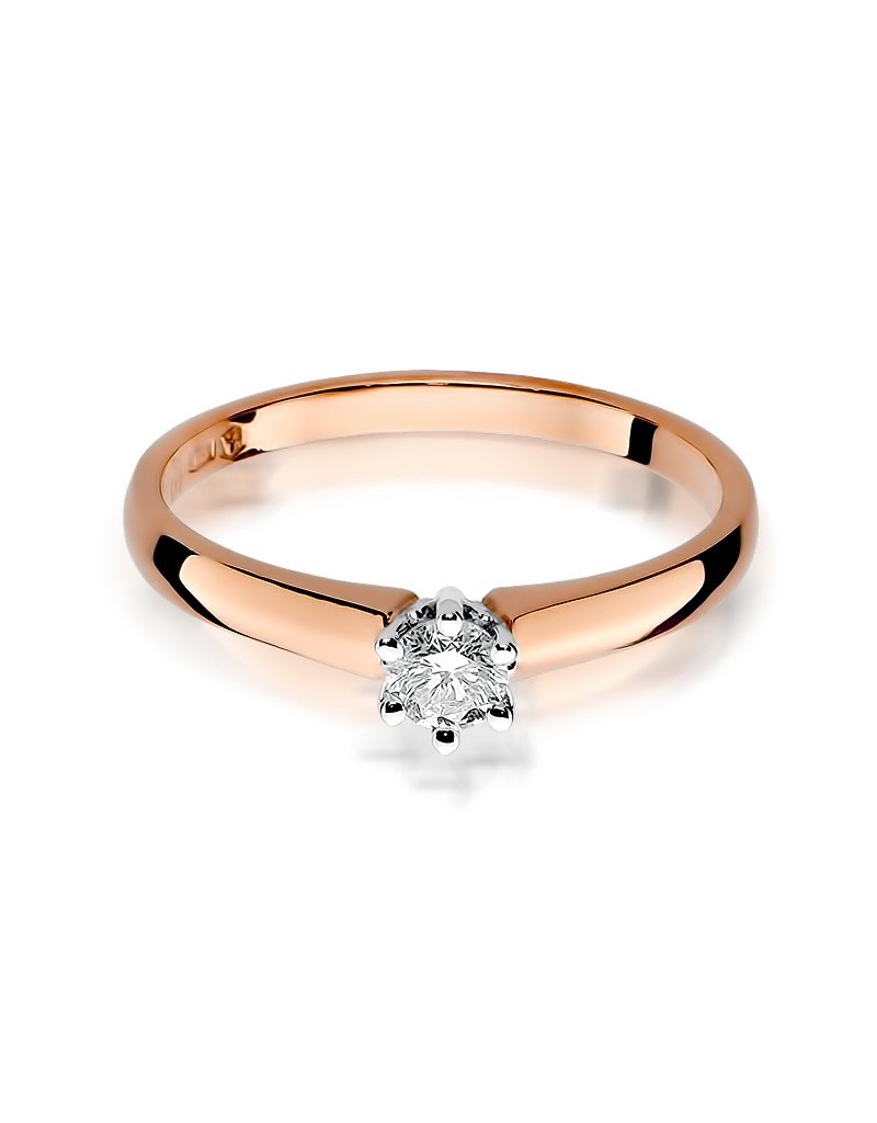 Klasyczny pierścionek z różowego złota z urokliwym brylantem w sześcioramiennej koronie.
