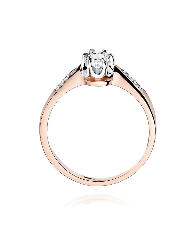 Unikatowy pierścionek wykonany z różowego złota z niezwykłym brylantem w sześcioramiennej koronie, oraz szyną ozdobioną brylantami.