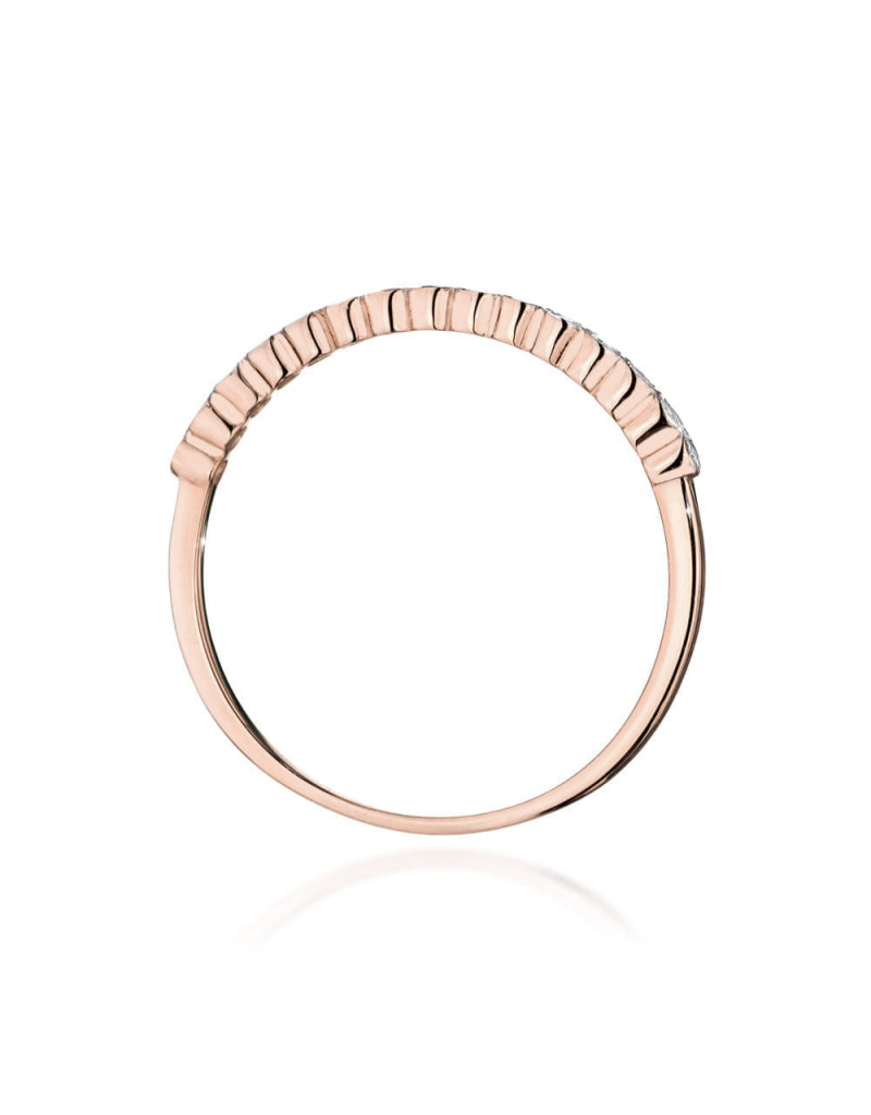 Pierścionek z brylantami w różowym złocie, niepowtarzalny obrączkowy wzór, idealnie pasuje na delikatną kobiecą dłoń.