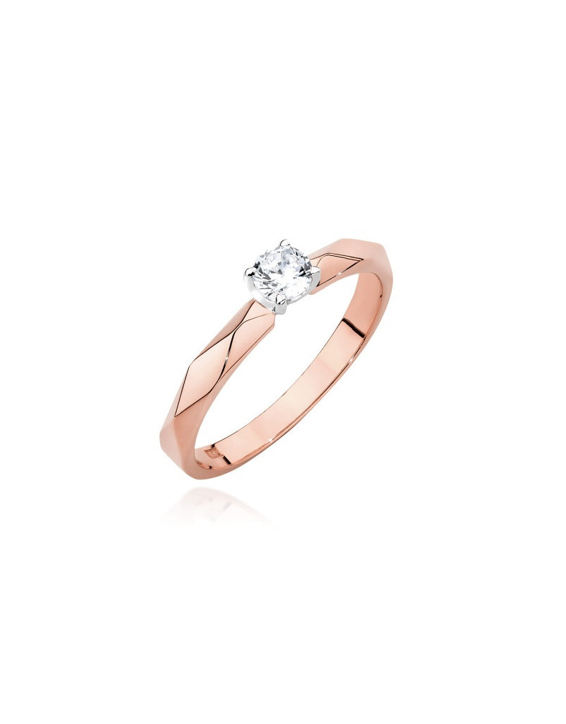 Pierścionek z brylantami w różowym złocie, niepowtarzalny i nowoczesny wzór, idealnie pasuje na delikatną kobiecą dłoń.