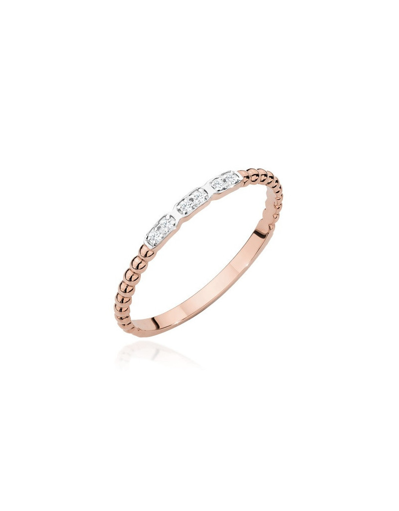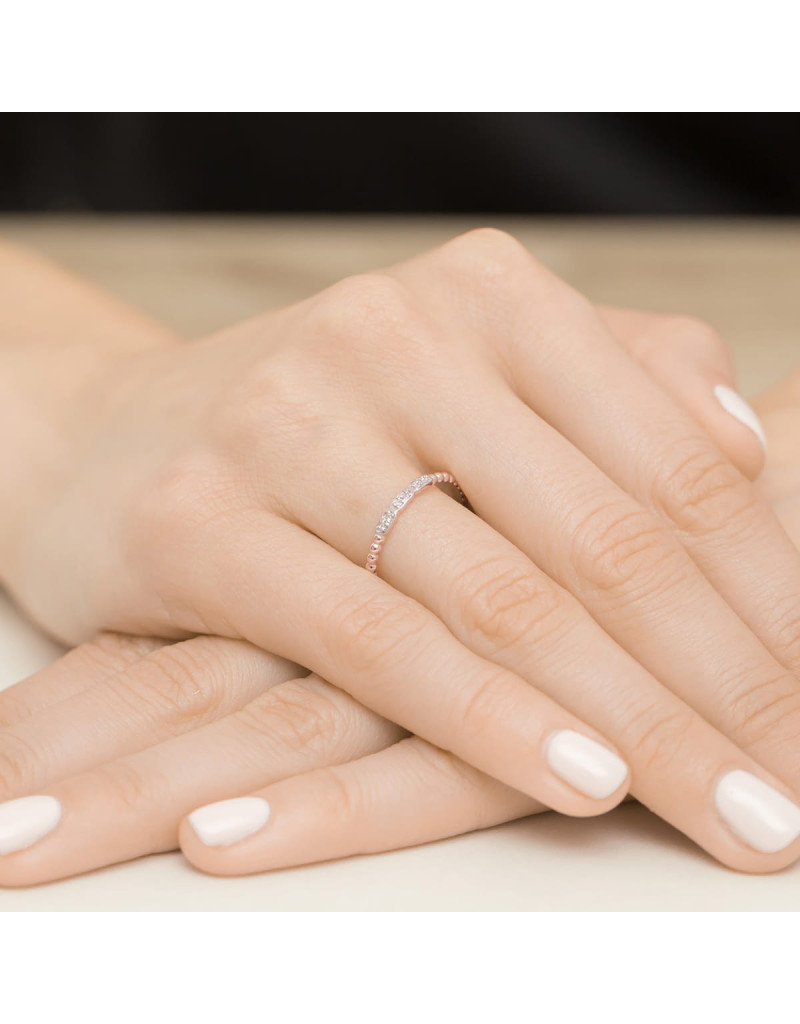 Pierścionek z brylantami w różowym złocie, niepowtarzalny i nowoczesny wzór, idealnie pasuje na delikatną kobiecą dłoń.