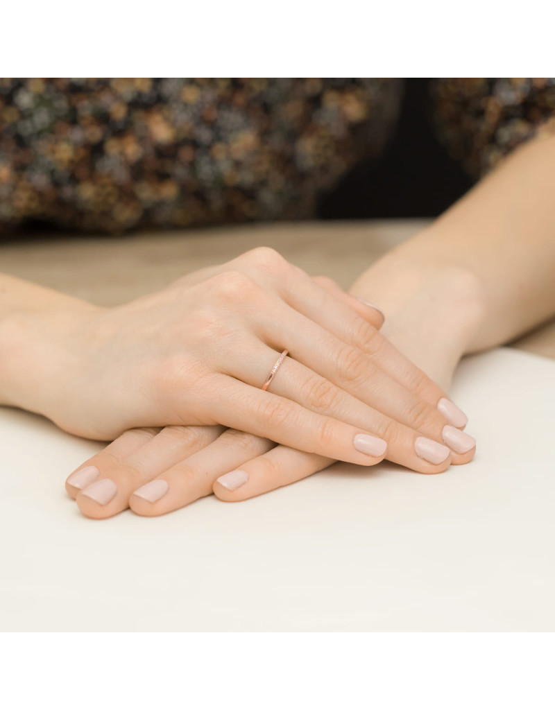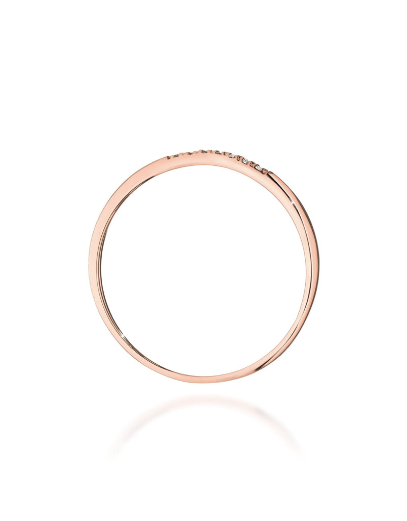 Pierścionek z brylantami w różowym złocie, niepowtarzalny obrączkowy wzór, idealnie pasuje na delikatną kobiecą dłoń.