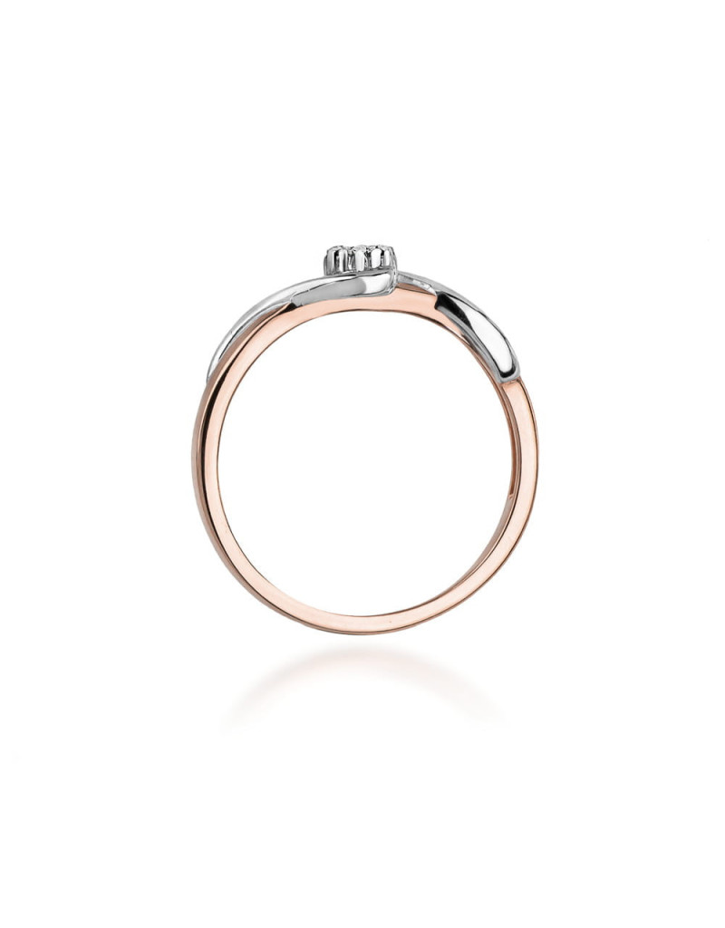 Niebanalny pierścionek z różowego złota z lśniącymi brylantami otulonymi białym złotem.
