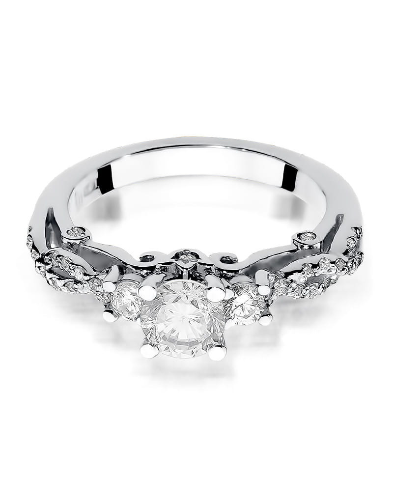 Oryginalny pierścionek z białego złota z brylantem głównym i towarzyszącymi mu w oprawie brylantami różnej wielkości.