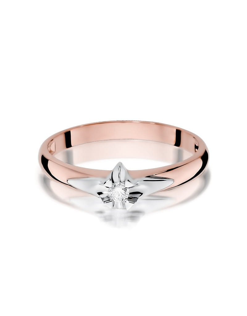 Nietuzinkowy pierścionek z różowego złota z brylantem w nowoczesnej oprawie podkreślony białym złotem.