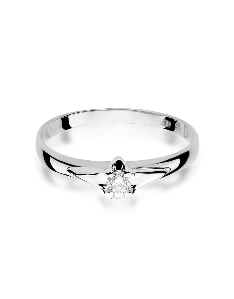 Nietuzinkowy pierścionek z białego złota z brylantem w nowoczesnej oprawie podkreślony białym złotem.