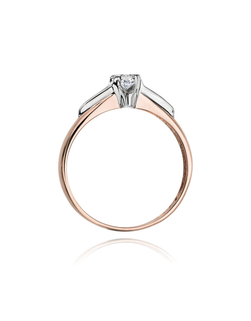 Nietuzinkowy pierścionek z różowego złota z brylantem w nowoczesnej oprawie podkreślony białym złotem.