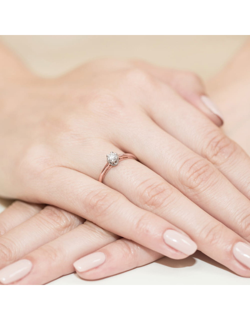 Elegancki pierścionek z różowego złota z lśniącym brylantem w sześcioramiennej koronie z białego złota.