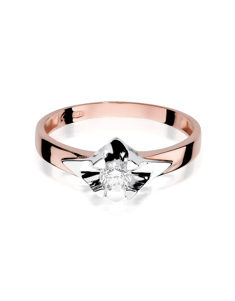 Stylowy pierścionek z różowego złota z magicznym brylantem osadzonym w oprawie z białego złota.