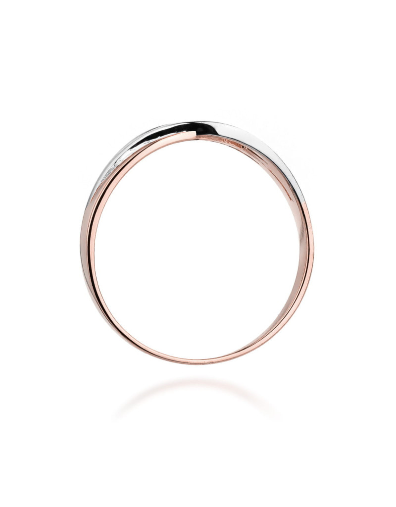 Nietuzinkowy pierścionek z różowego złota, ozdobiony falowaną szyną w białym złocie oraz brylantem dodającym uroku.