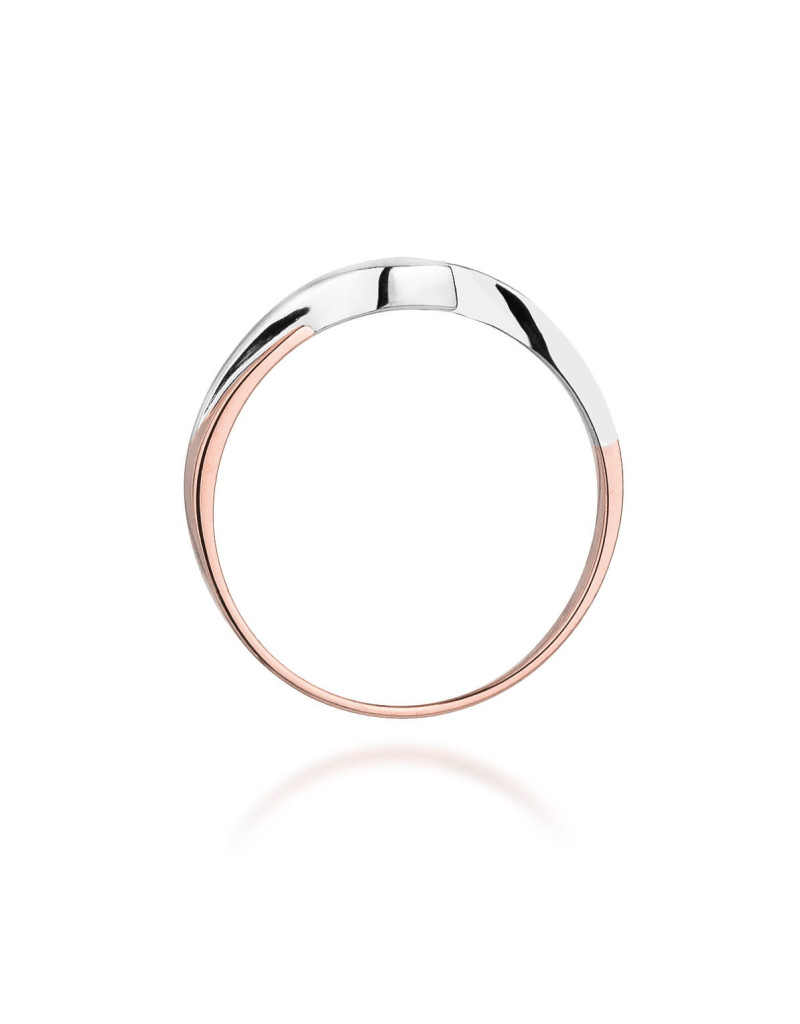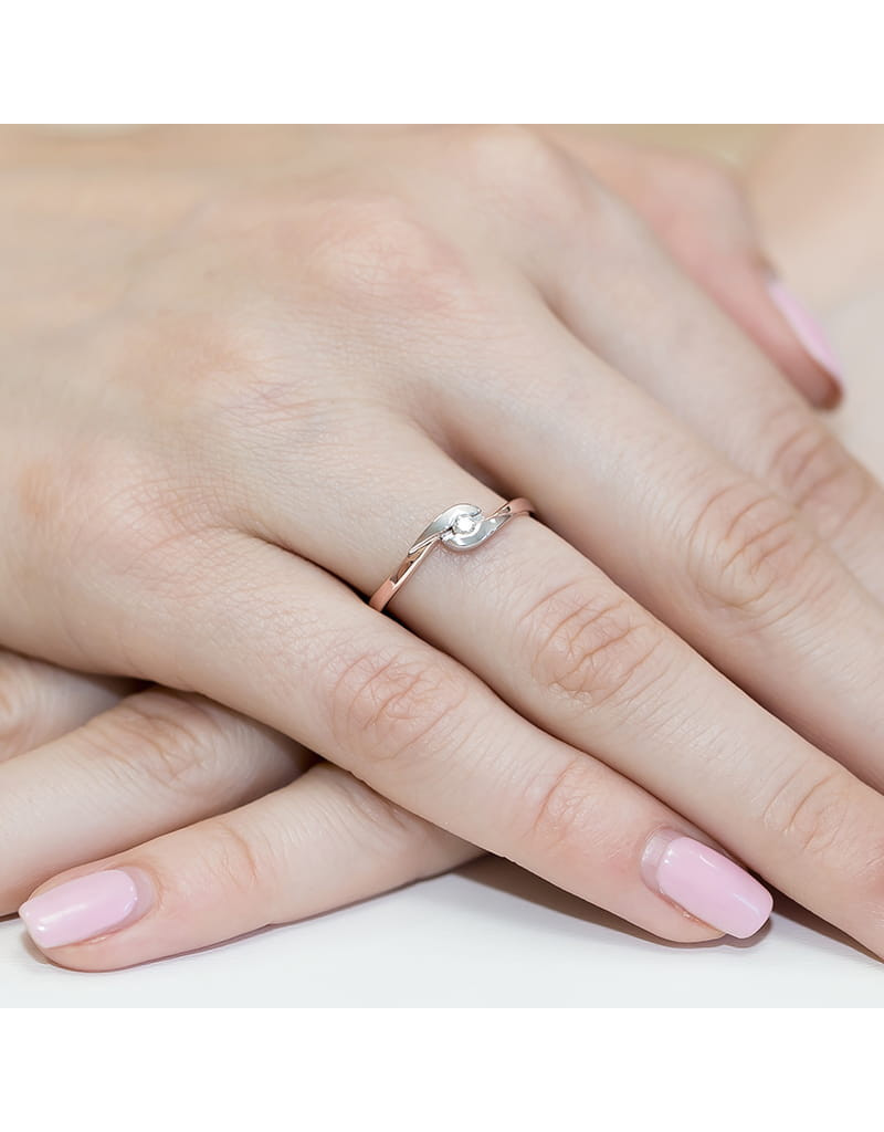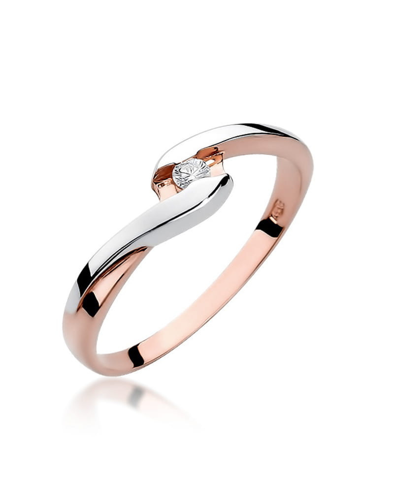 Gustowny, dwukolorowy złoty pierścionek z brylantem osadzonym w delikatnej formie.