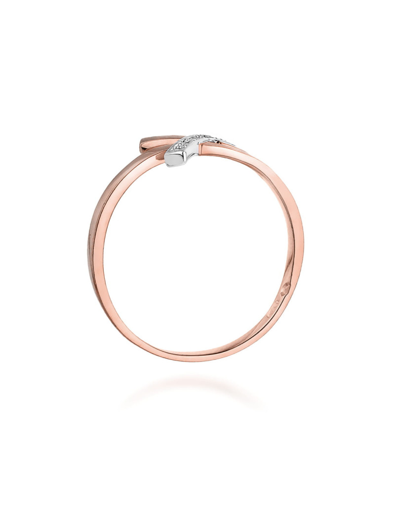 Fantazyjna forma pierścionka z różowego złota z wygiętą szyną ozdobioną białym złotem osadzoną brylantami.