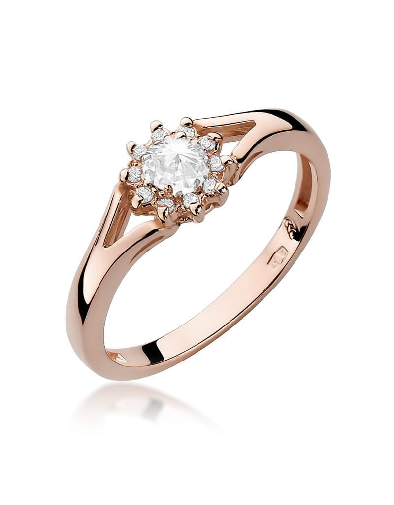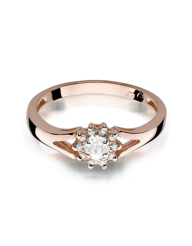 Niesamowity złoty pierścionek z okrągłym brylantem i mniejszymi wokół, w wyjątkowej oprawie.