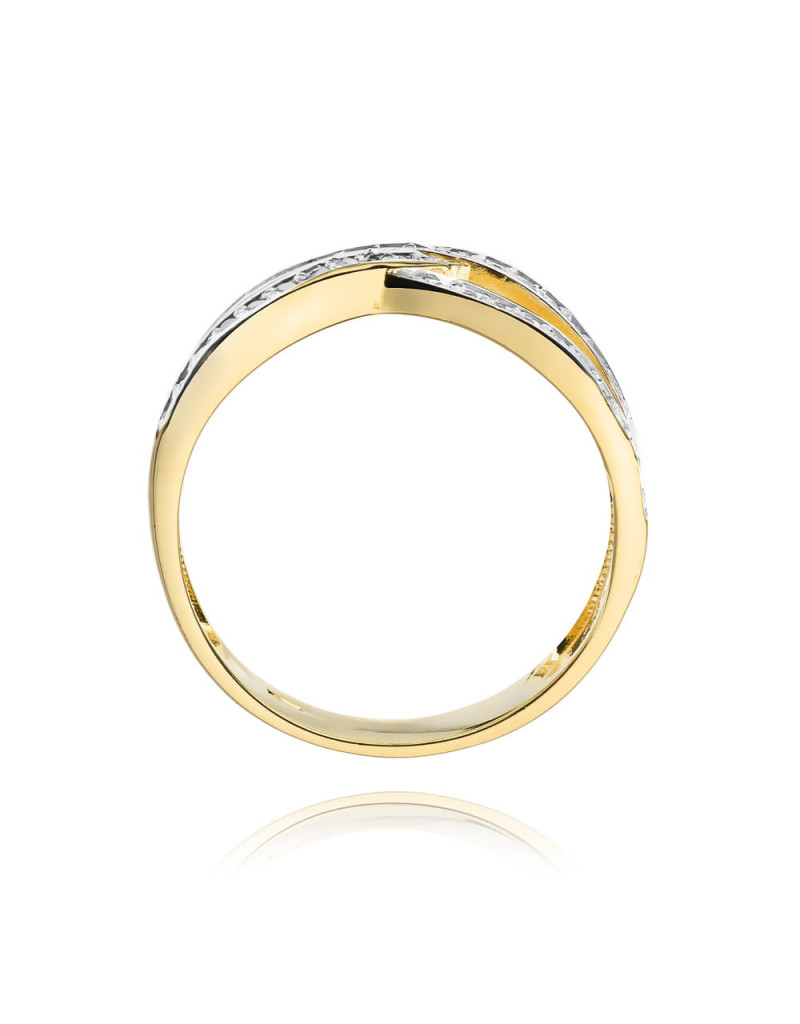 Ponadczasowy wzór złotego pierścionka z falującymi szynami, ozdobiony błyszczącymi brylantami.