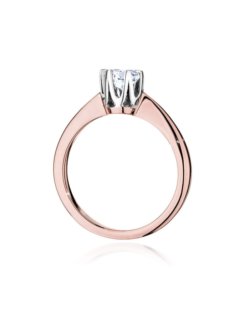 Luksusowy pierścionek wykonany z różowego złota z przepięknym brylantem w sześcioramiennej koronie z białego złota, pełnej blasku i lśnienia.