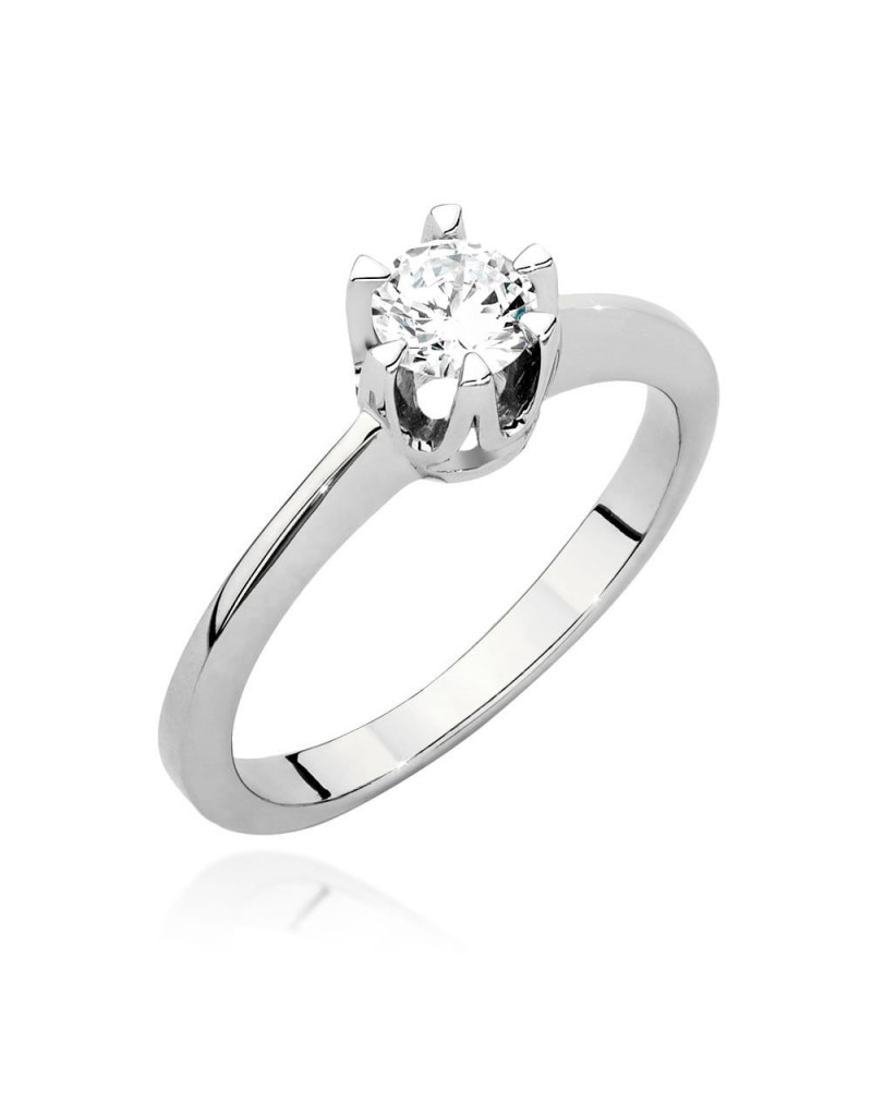 Luksusowy pierścionek wykonany z białego złota z przepięknym brylantem w sześcioramiennej koronie pełnej blasku i lśnienia.