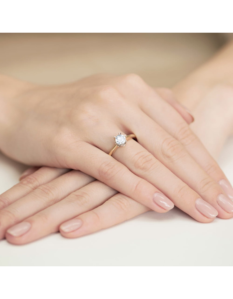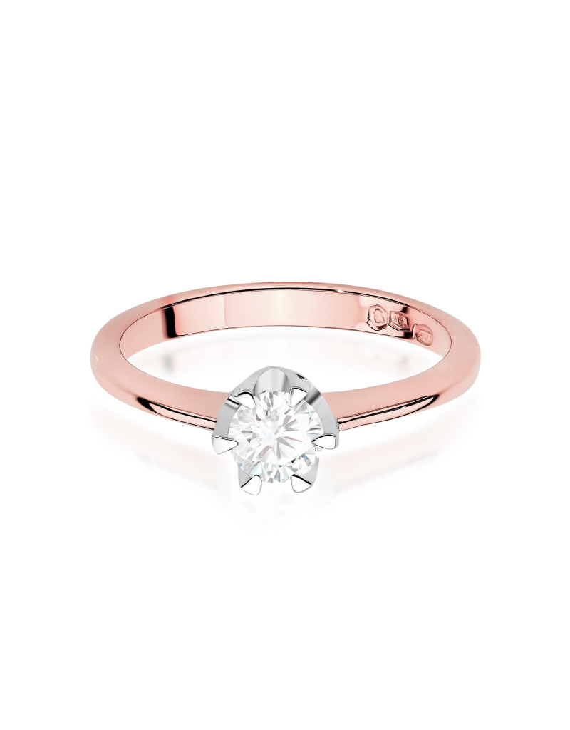 Luksusowy pierścionek wykonany z różowego złota z przepięknym brylantem w sześcioramiennej koronie z białego złota, pełnej blasku i lśnienia.