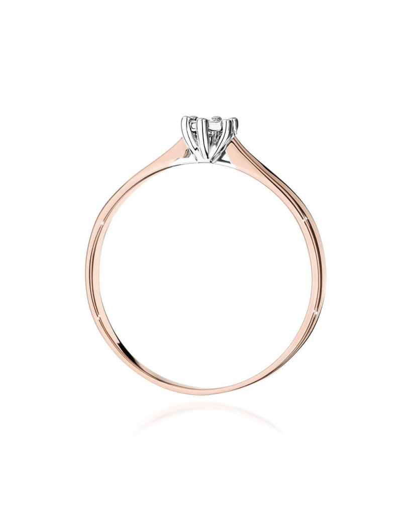 Romantyczny pierścionek z różowego i białego złota w klasycznej oprawie z zachwycającym brylantem w sześcioramiennej koronie.