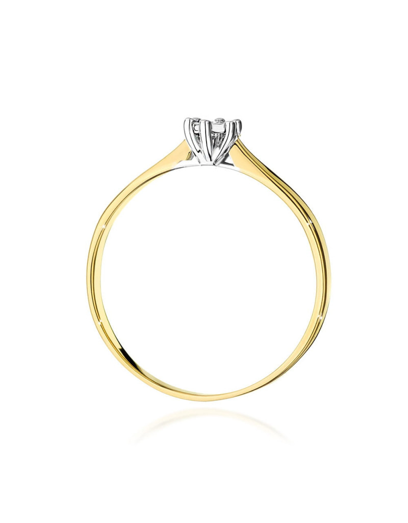 Romantyczny pierścionek z żółtego i białego złota w klasycznej oprawie z zachwycającym brylantem w sześcioramiennej koronie.