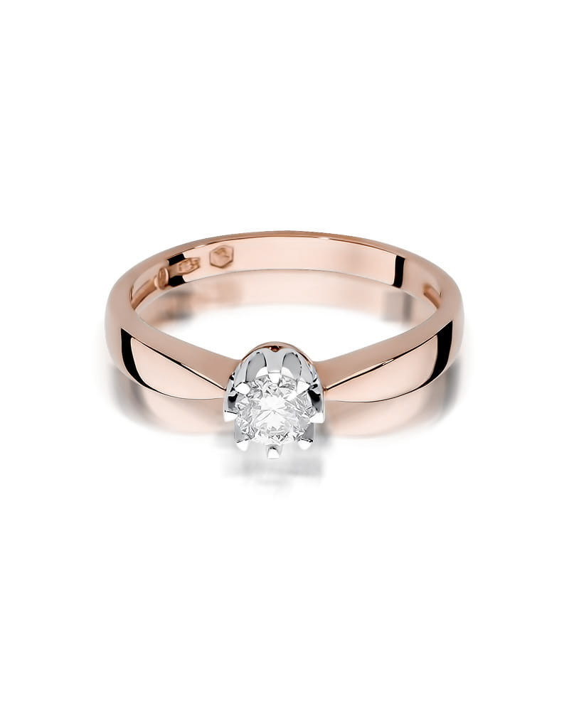 Klasyczny i elegancki pierścionek z różowego złota z przepięknym brylantem w czarującej ośmioramiennej koronie z białego złota.