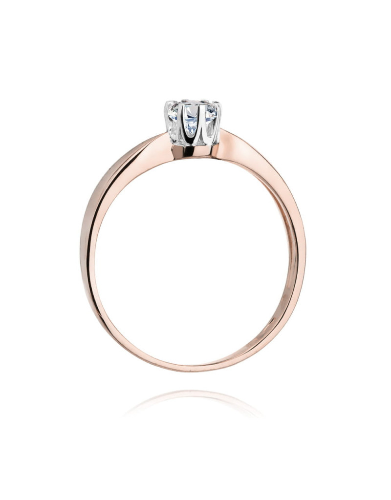 Klasyczny i elegancki pierścionek z różowego złota z przepięknym brylantem w czarującej ośmioramiennej koronie z białego złota.