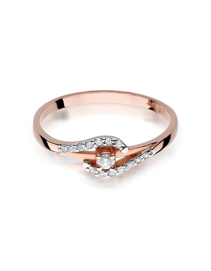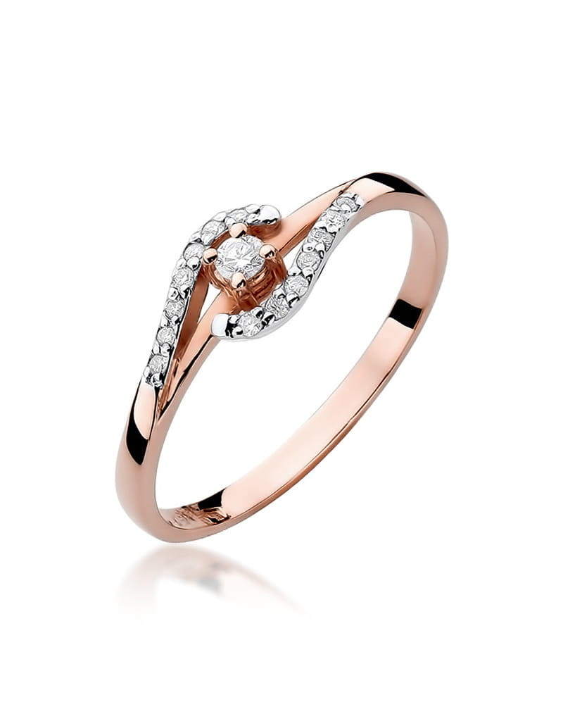Pełen blasku pierścionek z 15 brylantami oraz subtelną oprawą. Wykonany z różowego i białego złota.