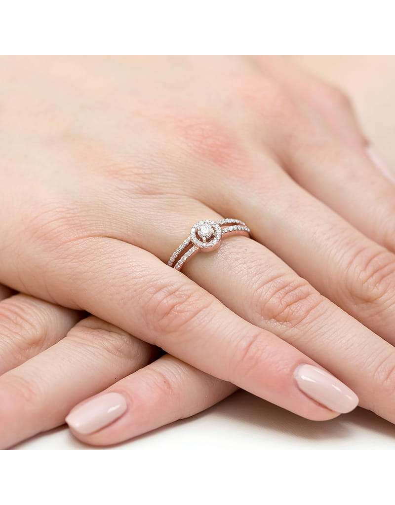 Bajeczny pierścionek z różowego i białego złota z olśniewającą oprawą którą zdobią krystaliczne brylanty.