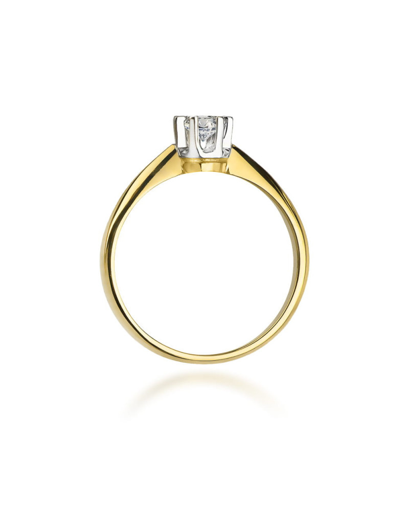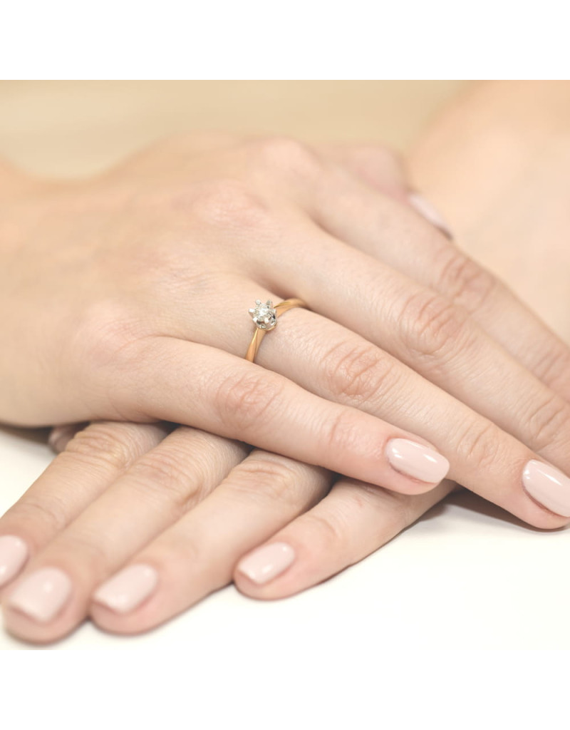 Subtelny złoty pierścionek z sześcioramienną koroną z białego złota, która podkreśla lśniący brylant.