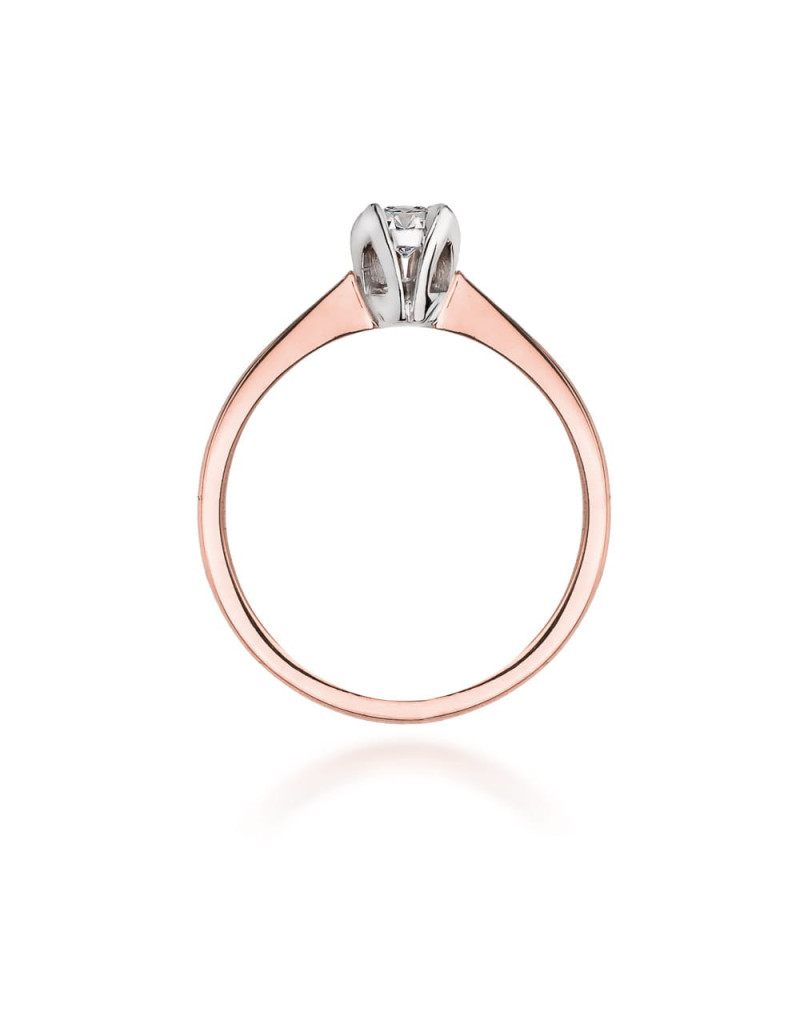 Romantyczny pierścionek z żółtego i białego złota z delikatnie oprawionym brylantem w czteroramiennej koronie.