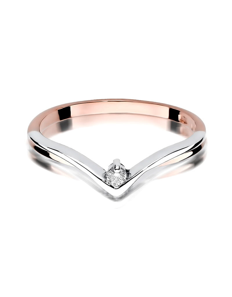 Subtelny, dwukolorowy pierścionek z nowoczesną formą oraz lśniącym brylantem.
