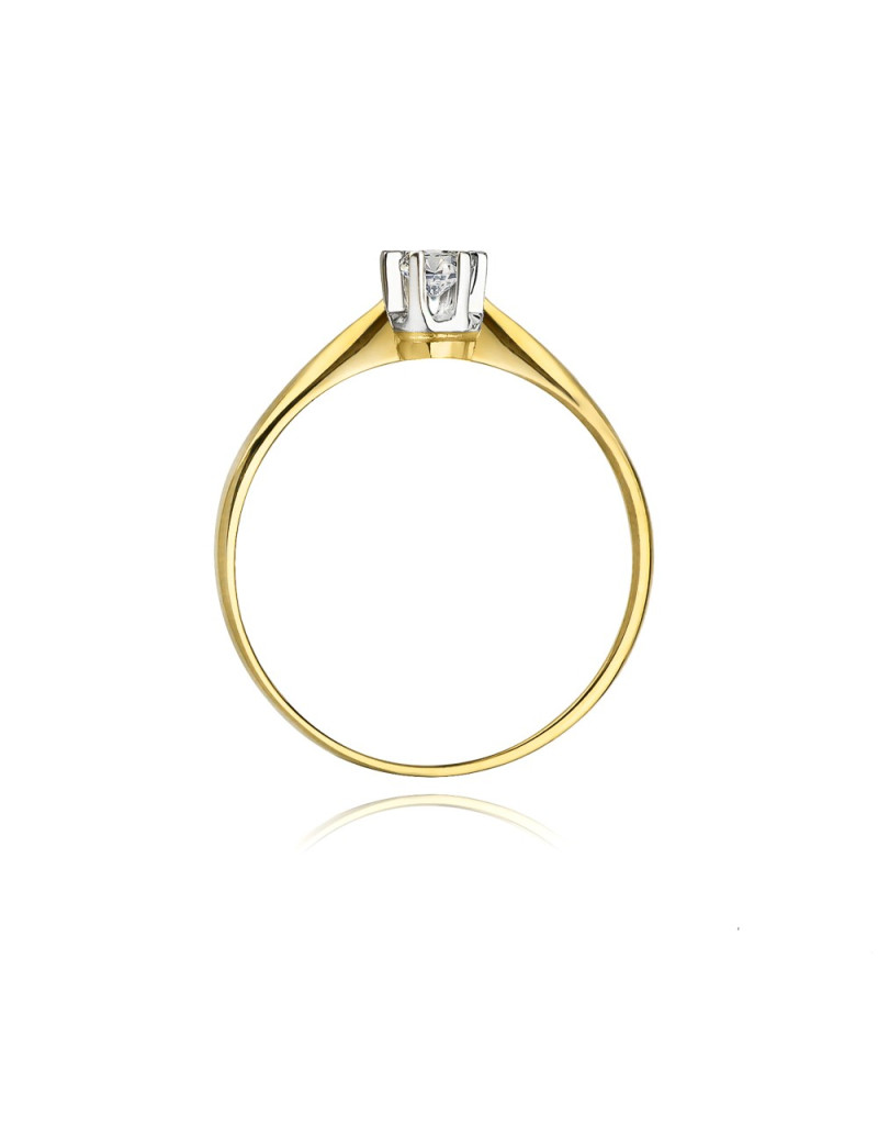 Subtelny złoty pierścionek z sześcioramienną koroną z białego złota, która podkreśla lśniący brylant.