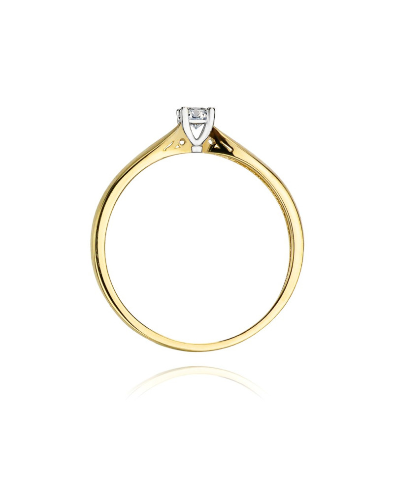 Elegancki, luksusowy pierścionek z żółtego złota z olśniewającym brylantem w czteroramiennej koronie z białego złota.