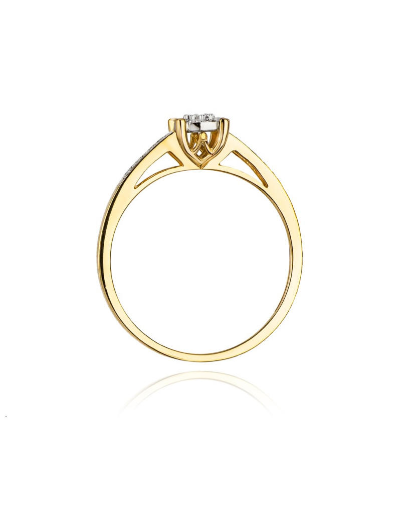 Fantazyjny, urokliwy złoty pierścionek z pełnymi blasku brylantami w krystalicznej oprawie.