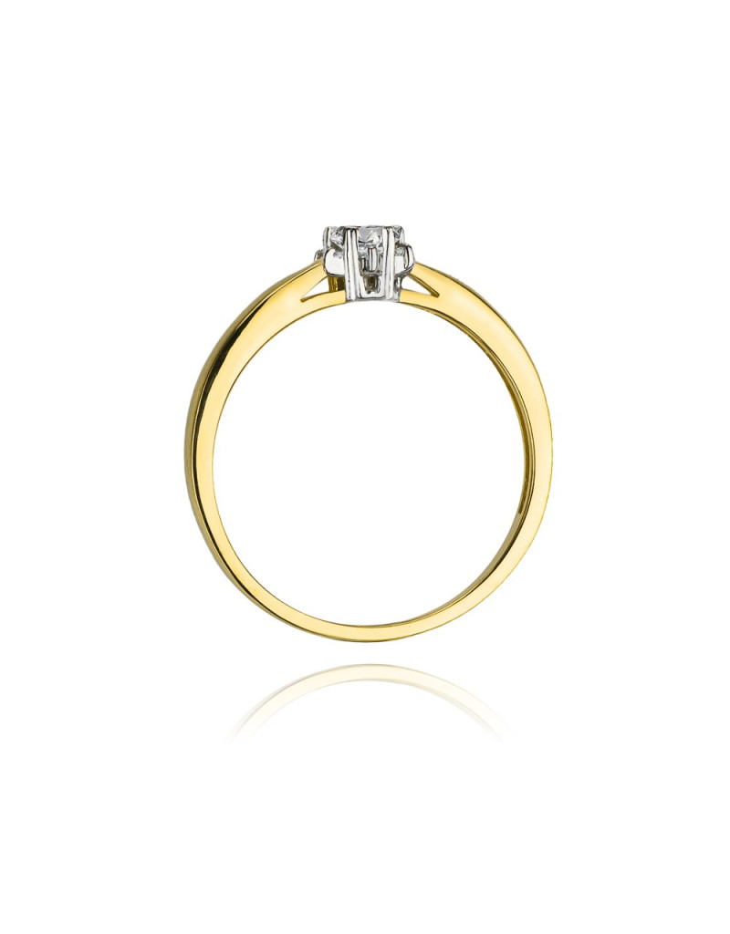 Subtelny pierścionek z żółtego złota z niesamowitą brylantową oprawą, idealny na delikatną kobiecą dłoń.