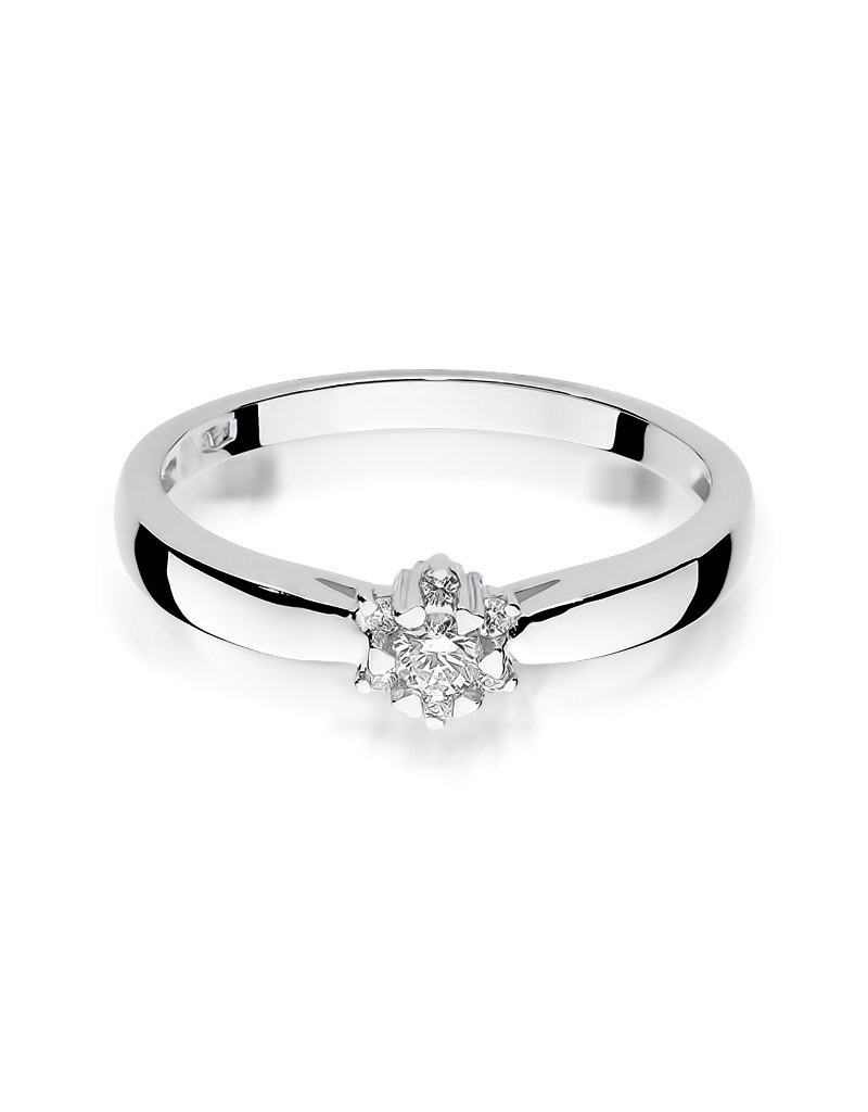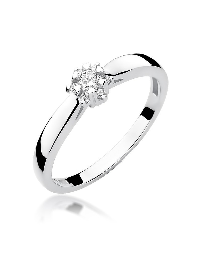 Subtelny pierścionek z białego złota z niesamowitą brylantową oprawą, idealny na delikatną kobiecą dłoń.