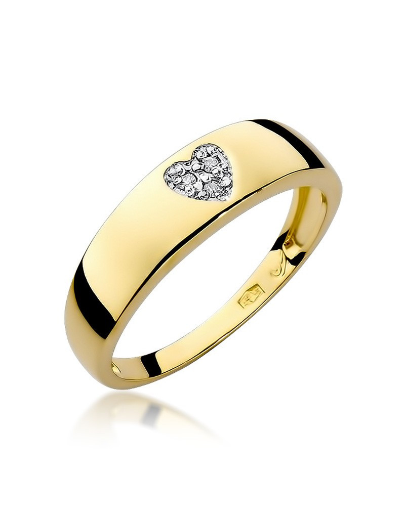 Symbol miłości w nowoczesnym stylu, pierścionek z żółtego złota z serduszkiem i lśniącymi brylantami w środku.